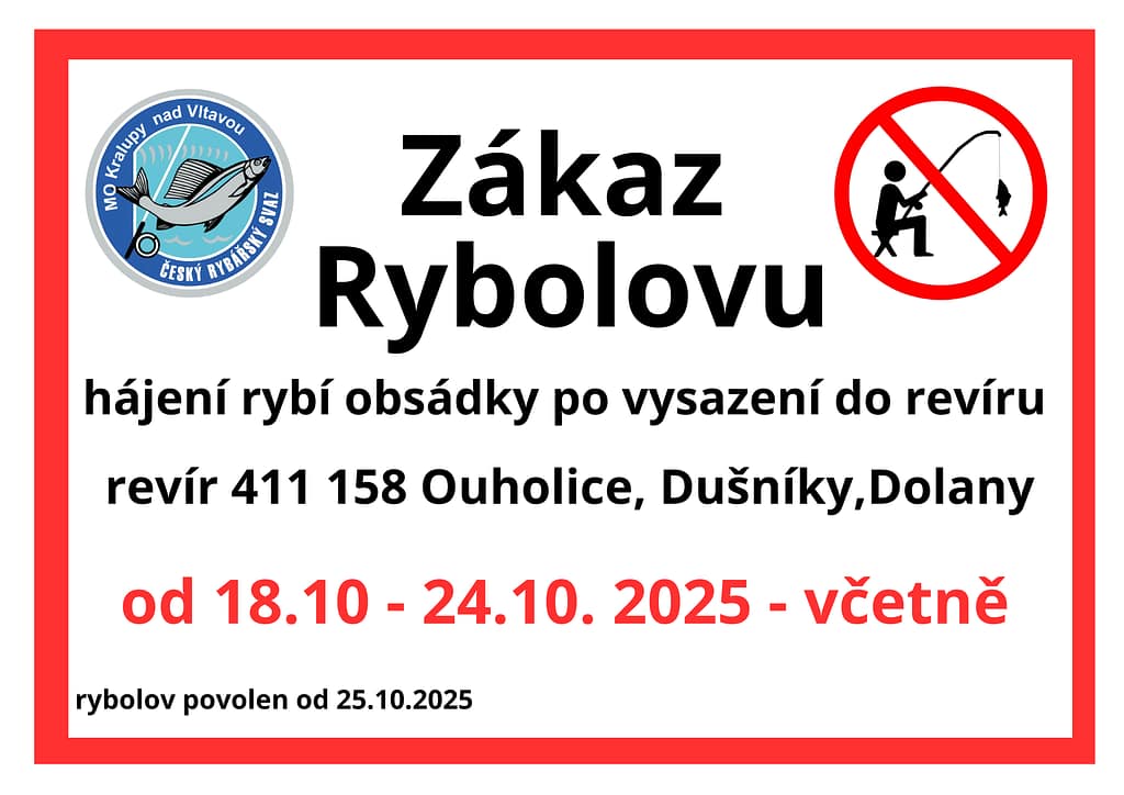 V termínu od 18.10.2025 – 24.10.2025 včetně. Rybolov bude umožněn od 25.10.2025
